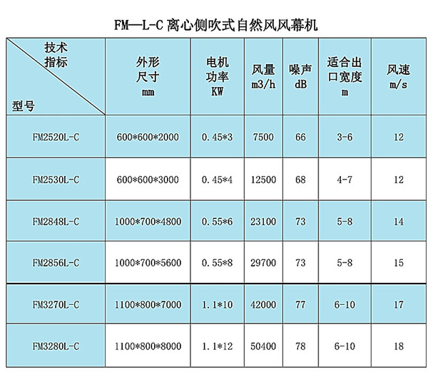 FM-L-C-離心側(cè)吹式風(fēng)幕機是在A系列基礎(chǔ)上的改進(jìn)機型,采用小型離心風(fēng)機,外形更美觀,風(fēng)機噪音低。適合安裝在高度4米以上,寬度6米以內(nèi)的門洞側(cè)面。適用于大型的商場、倉庫、廠房的高大門洞使用。