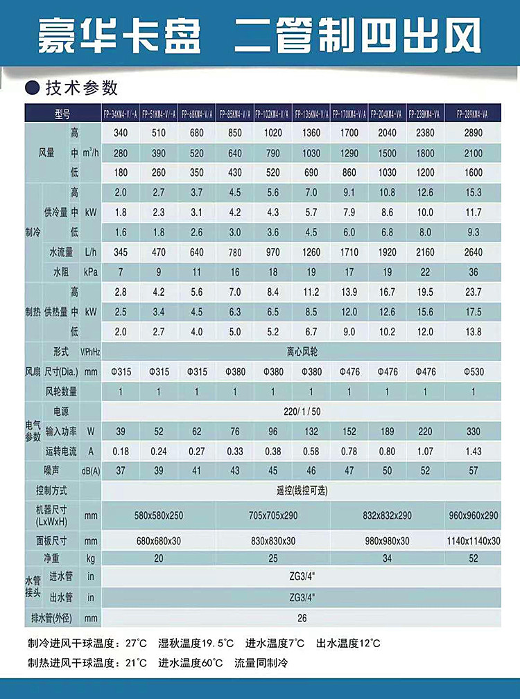 FP-KM卡式明裝風機盤管是專為餐廳、會議室、營業(yè)廳、門店等場所推出的一種新型風機盤管。它的機外靜壓為30Pa,設計風量為340m3/h—2380 m3/h。額定冷量為2-13KW,額定熱量為3.2-20KW,單臺適用于13-90平米的房間。