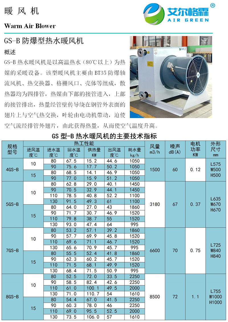 GS-B防爆型高溫?zé)崴L(fēng)機(jī)是在普通型GS熱水暖風(fēng)機(jī)基礎(chǔ)上的延伸產(chǎn)品。采用BT35-11防爆型軸流風(fēng)機(jī),適合煤礦、化工等特殊行業(yè)。