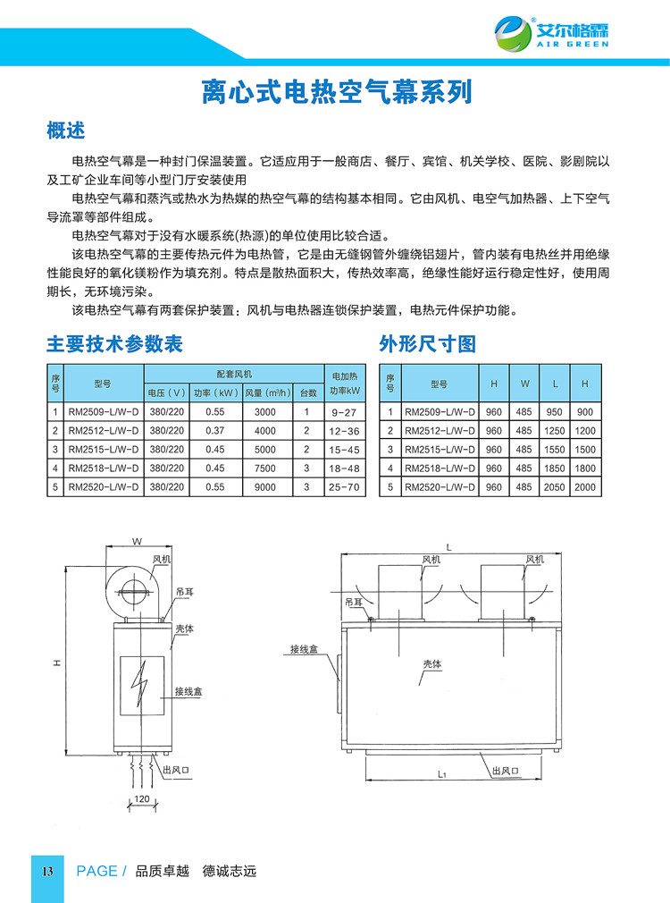 RM-L-D型電加熱離心式熱風幕機、FM-L自然風型離心式風幕機由單速離心風機、金屬翅片管電加熱器(自然風型不帶電加熱器)、百葉風口、鋼板外殼組成。選用200mm或250mm離心風輪,風量大、風速大、風壓高,隔斷效果優(yōu)良,形式多樣,保護功能齊全,適用于大型工業(yè)建筑、停車場、庫房等場所的高大出入口使用。適合3米-5米的安裝高度。