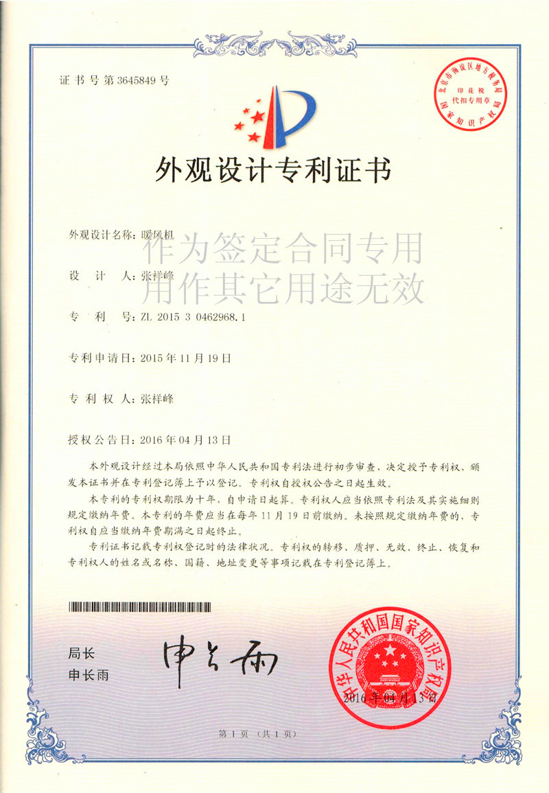 由德州艾爾瑪空調(diào)生產(chǎn)的“艾爾格霖”品牌GS/TS/Q/D/型工業(yè)暖風(fēng)機(jī)系列,近日取得國家知識產(chǎn)權(quán)局頒發(fā)的《外觀設(shè)計專利證書》。專利號:ZL201530462968.1
