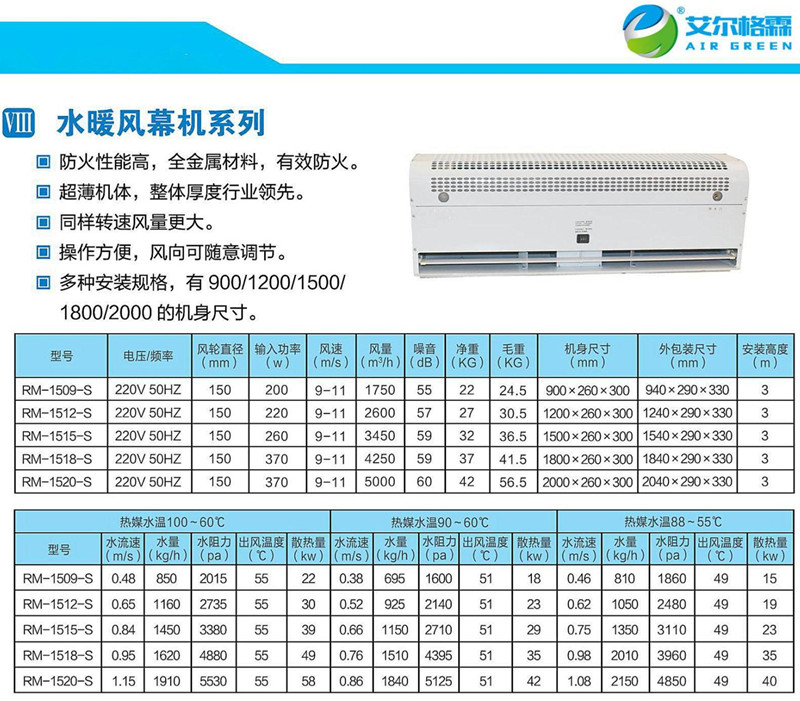 貫流式冷熱水空氣幕的型號(hào)一般是用字母加數(shù)字表示的,RM1515-S就是常見的規(guī)格型號(hào)之一,R是“熱”的首字母,M是“幕”的首字母,連在一起是熱風(fēng)幕的意思,數(shù)字1515中個(gè)15,表示貫流風(fēng)輪的直徑是150mm,第二個(gè)15表示風(fēng)幕機(jī)的長度是1.5米,后面的S表示冷熱水型。