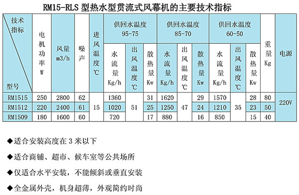 貫流式冷熱水空氣幕的型號(hào)一般是用字母加數(shù)字表示的,RM1515-S就是常見(jiàn)的規(guī)格型號(hào)之一,R是“熱”的首字母,M是“幕”的首字母,連在一起是熱風(fēng)幕的意思,數(shù)字1515中個(gè)15,表示貫流風(fēng)輪的直徑是150mm,第二個(gè)15表示風(fēng)幕機(jī)的長(zhǎng)度是1.5米,后面的S表示冷熱水型。