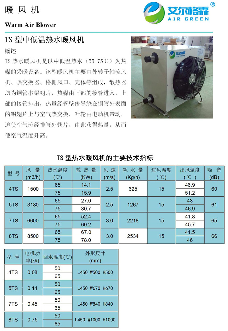 TS工業(yè)冷暖風(fēng)機(jī)是以中低溫?zé)崴?5-75℃)為熱媒的采暖設(shè)備。該型暖風(fēng)機(jī)主要由外轉(zhuǎn)子軸流風(fēng)機(jī)、熱交換器、格柵風(fēng)口、殼體等組成,散熱器均為銅管串鋁翅片,熱媒由下部的接管進(jìn)入,上部的接管排出,熱量經(jīng)管壁傳導(dǎo)繞在銅管外表面的鋁翅片上與空氣熱交換,葉輪由電動機(jī)帶動,迫使空氣流經(jīng)排管外翅片,由此獲得熱量,從而使空氣溫度升高。