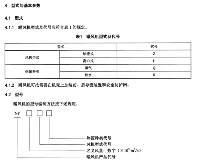 按照新的行業(yè)標準《JB/T7225-2017暖風(fēng)機》,暖風(fēng)機按照風(fēng)機型式分為軸流式和離心式,軸流式用字母“Z”表示,離心式用字母“L”表示。按照熱源種類分為蒸汽型和熱水型,蒸汽型代號為“Q”,熱水型代號為“S”。暖風(fēng)機產(chǎn)品代號為“NF”。更多信息見下圖: